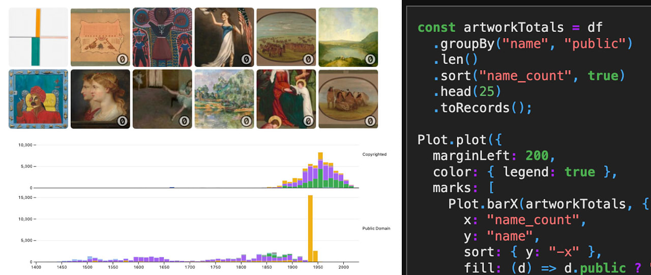 Exploring Art with TypeScript, Jupyter, Polars, and Observable Plot — One of Deno’s compelling features is its support for Jupyter Notebooks and easy notebook-style programming, such as is common in the Python world. Trevor looks at a practical use of using such a notebook environment for data exploration. Trevor Manz |